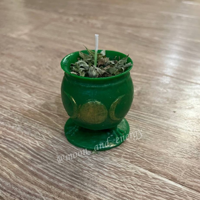 Данный котёл выполнен из натурального пчелиного воска с добавлением трав, собранных мной, эфирных масел, направленных на финансовое благополучие